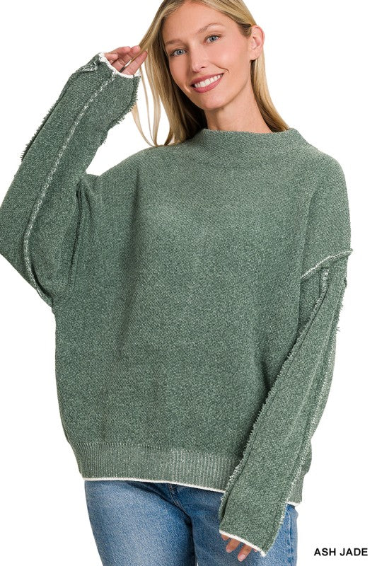 Oversized Mock Neck Raw Seam Chenille Sweater