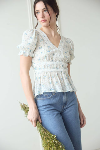V NECK CROCHET LACE TRIM FLORAL TOP