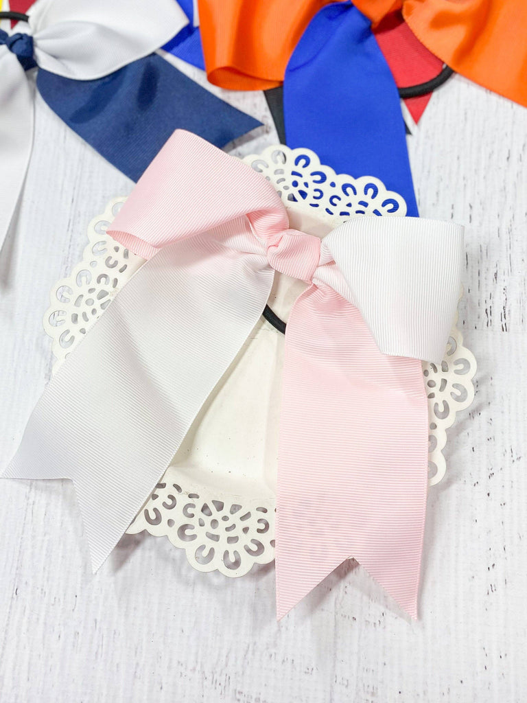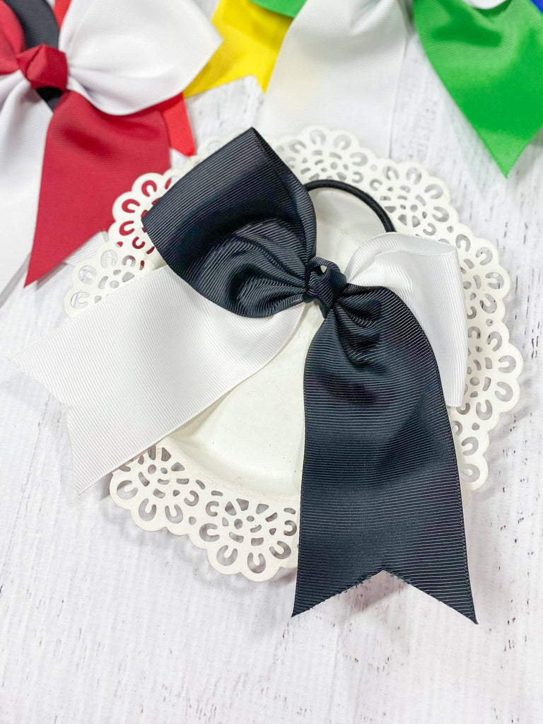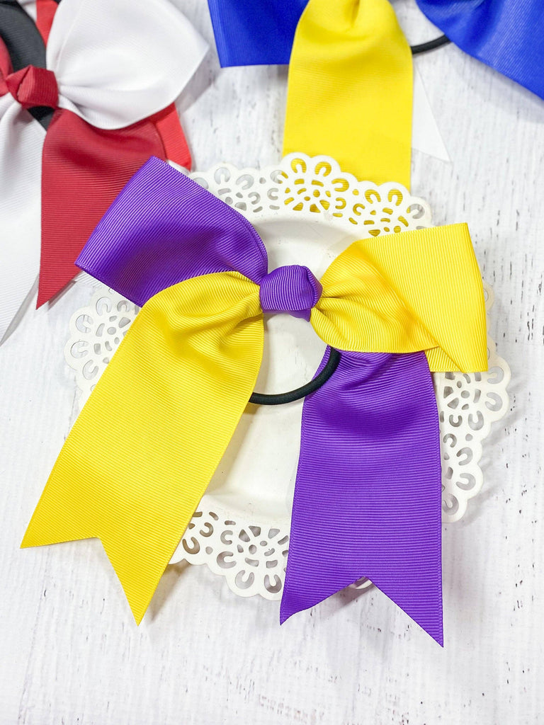 Show off your school pride and spirit with our School Spirit Cheer Bows! Perfect for game days, pep rallies, and more! Get ready to cheer in style! How big is my bow? Approx: 5.5" x 6.5" Ribbon Size: 2.25" Clip Type: Pony-o