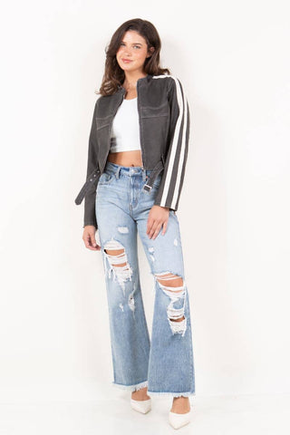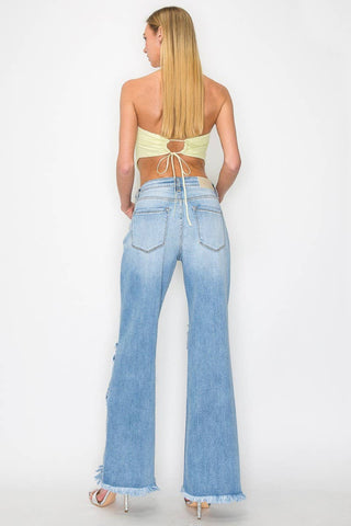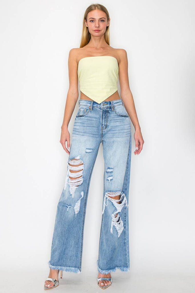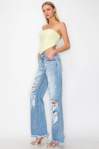 Hybrid cool has arrived. Our high-rise wide leg jeans feature a unique rigid marble front for that natural distressed look, paired with a super comfy stretch back. Complete with heavy distressing and a natural frayed hem for effortless edge.